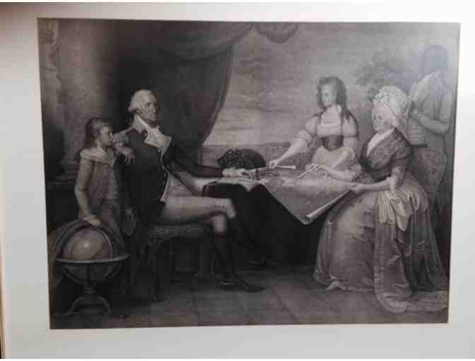 This is a framed black and white print of a famous life-sized portrait of George Washington and his family, painted by Edward Savage, finished in 1796 and now hanging in the National Gallery of Art in Washington D.C. The size of the frame is about 30 inches in length and 25 inches in height. The frame is a simple narrow black wooden frame with a slight gold insert.