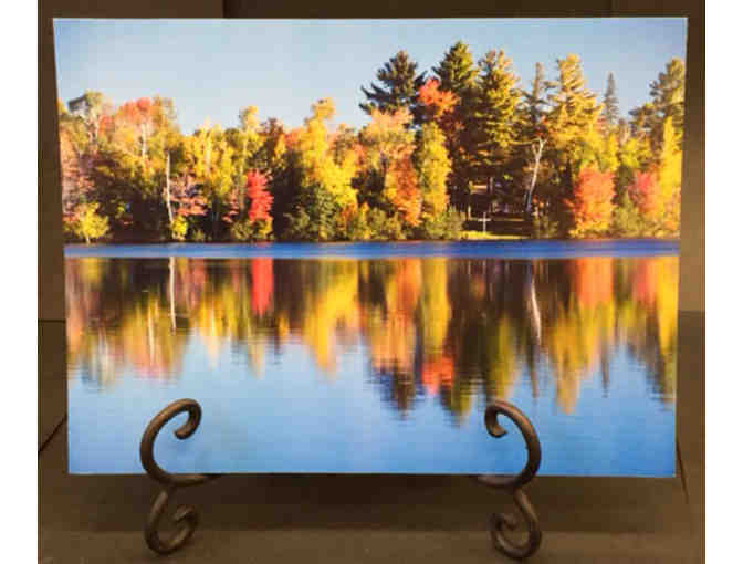 Autumn leaves are reflected in a clear, blue lake in this scene, captured by James Edwards, nature photographer. Photo is 11"x8", matte finish, mounted on foam core, comes with metal stand.