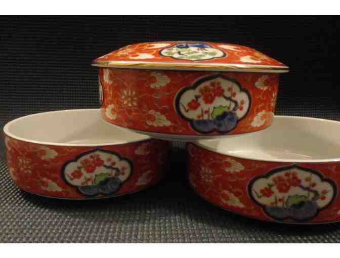 Set of 3 Ceramic Bowls, Japanese Decorate. Includes one Lid.