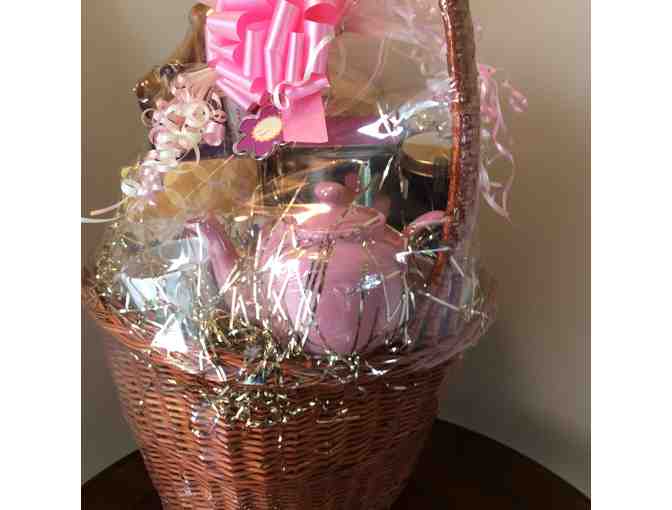 A pink tea pot reminiscent of the British Brown Betty, several tea canister selections, tea bag caddie, sugar canister, tea cups and goodies galore. What a great birthday or upcoming Christmas gift.