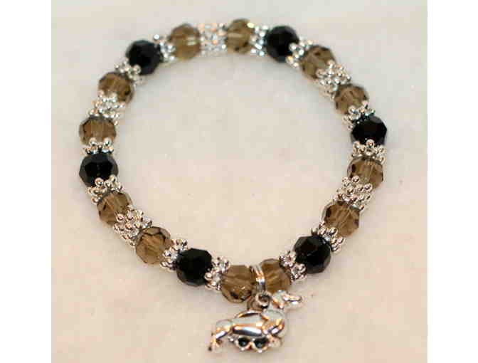 This beautiful bracelet was handmade by one of our fantastic adopters! Features a dachshund charm alongside a pawprint charm, and gorgeous brown crystals with silver spacers. This bracelet is made on stretch cord and will fit any wrist. This is a stunning piece and would make a fantastic gift!