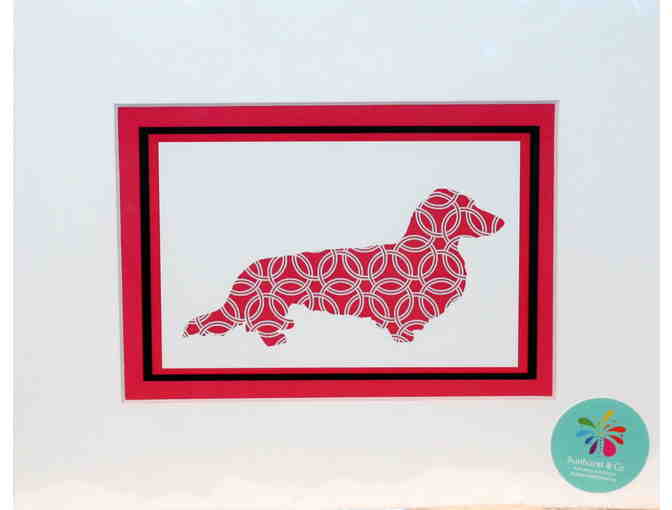 This beautiful matted print by Charlotte Collier features a longhaired dachshund silhouette in a pink graphic print. Would make a great addition to your home. This print is unframed.