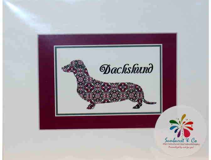 This beautiful matted print by Charlotte Collier features a shorthaired dachshund silhouette in a maroon and black graphic. Would make a great addition to your home. This print is unframed. 8" x 10"