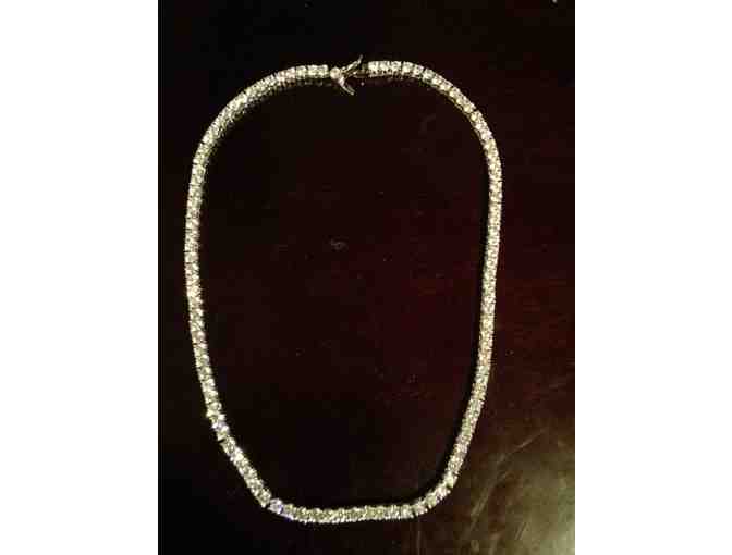 This stunning tennis necklace marries luxury with style in a piece of time-honored artistry and is perfect for special occasions. A classic staple, this tennis necklace is 17 inches in length. (We will shorten it at your request at the time of your order.) This has over 40 round cubic zirconia stones. Each stone is from our selective and exquisite "Fiery Select" brand of high end cubic zirconia. These very lively stones measure 4 mm and are equivalent to diamonds that are .25 in carat weight. These are big stones and this necklace makes a statement. This bridal jewelry necklace really looks like real diamonds.