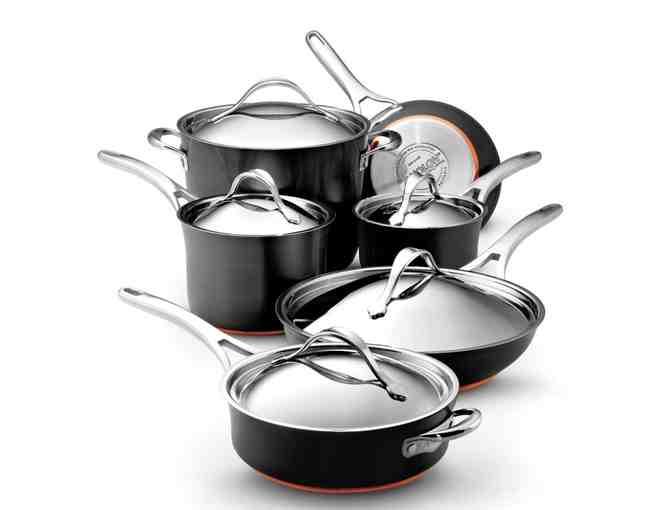 The Anolon Nouvelle Copper Hard-Anodized Nonstick 11-Piece Cookware Set features durable, hard-anodized construction crafted with copper to deliver optimum heat control and perfect cooking performance. The cookware's copper and aluminum provide superior heat conduction, and the stainless steel base makes this cookware suitable for all cooktops, including induction. Premium-quality nonstick delivers enduring food release and easy cleaning, and is metal utensil safe. With its attractive tulip shape and excellent heat conduction, Anolon Nouvelle Copper cookware delivers timeless performance that will be treasured for years to come. Oven safe to 500°F, this 11-Piece Set includes 1.5 quart & 3 quart Covered Saucepans, 8 quart Covered Stockpot, 8.5-inch Open Skillet, 12-inch Covered Skillet, and a 3 quart Covered Sauté with Helper Handle.