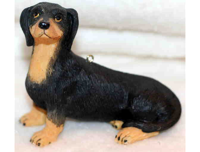This adorable little resin ornament has a ton of detail and features an adorable little sitting dachshund with a hook for hanging.  Great for gift giving or for your own tree!