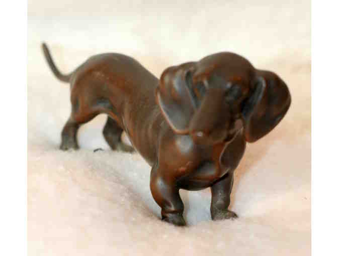 This brass dachshund with an extra long tail measures approx 6" long and 2" high.  Nice vintage collector's item, great for a gift or to add to your own dachshund collection!