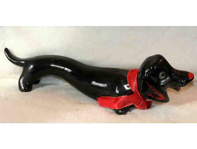 This extra long dachshund figurine is definitely from the 1950s or so....black ceramic with red accents Appears to be handpainted. Very unique, one-of-a-kind item.