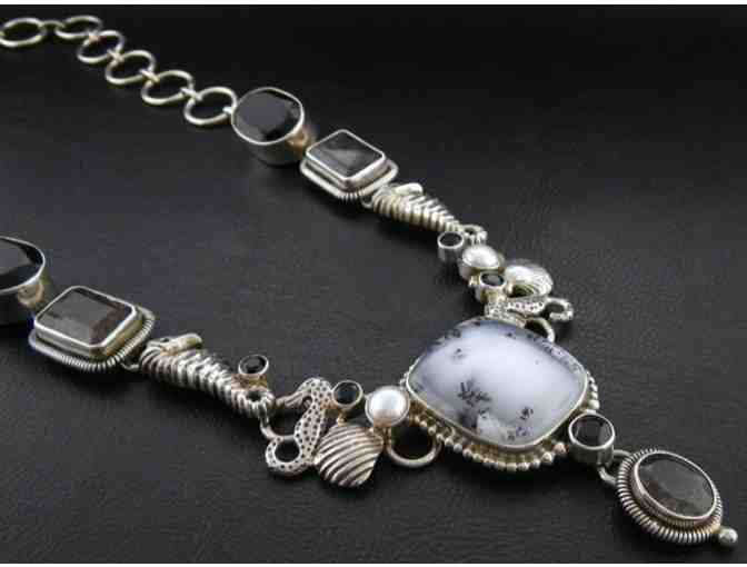 • Sterling silver seahorses, shells and mabe pearls dance with gems of the earth - dendritic agate, rutilated quartz and deep, dark onyx.