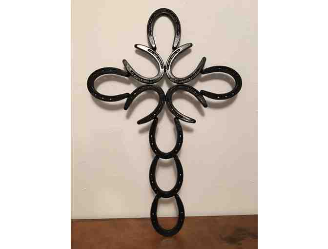 Charles welded real horshoes together and Alice painted the cross! Dimensions are 16" across and 24" tall!
