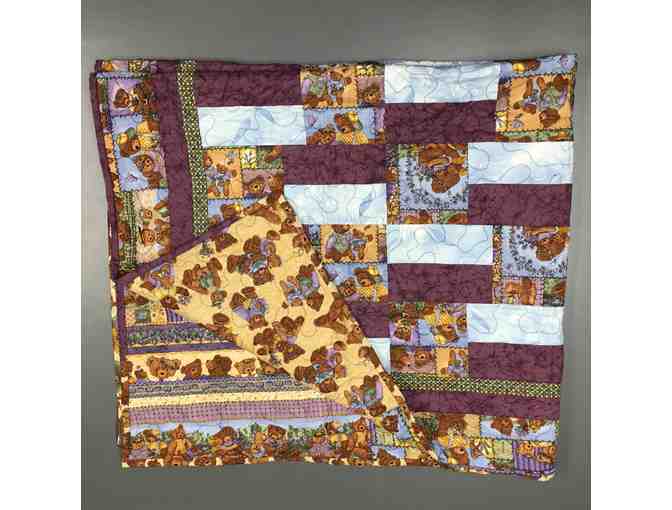 This beautiful handmade bear quilt was created by The Old Capitol Quilters Guild and is perfect for a nursery or shower gift. It is 50.5" x 57". Made with a lovely cotton fabric for easy care, the back of the quilt uses fabric that compliments the design.