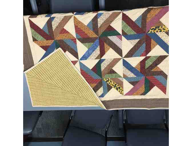 This beautiful handmade quilt was created by The Old Capitol Quilters Guild. It is 70" x 56.25". Made with a lovely cotton fabric for easy care, the back of the quilt uses fabric that compliments the design.