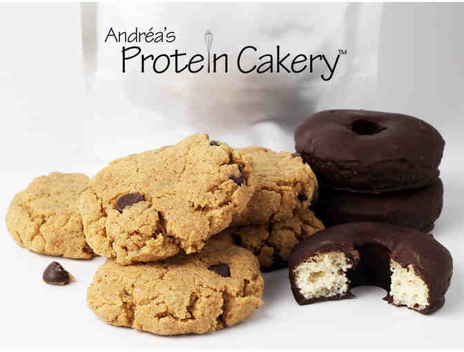 All-natural, high-protein, gluten-free cookies and donuts by Andréa's Protein Cakery. Delicious, healthy treats with no refined sugars! This Bakeshop Sampler includes a dozen each of Chocolate Chip Cookies, Peanut Butter Cookies, and Chocolate Covered Mini Donuts, all with full nutritional information and ingredients list. Also includes a sample of high-protein Vanilla Bean Cake Mix!