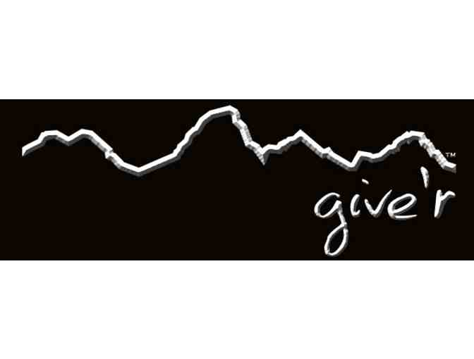 Give'r merchandise package for women including, Ski Wyoming beanie, Give'r trucker hat, classic Give'r tee (size Large), Give'r croakies, pink Give'r sunglasses, and a variety sticker set.