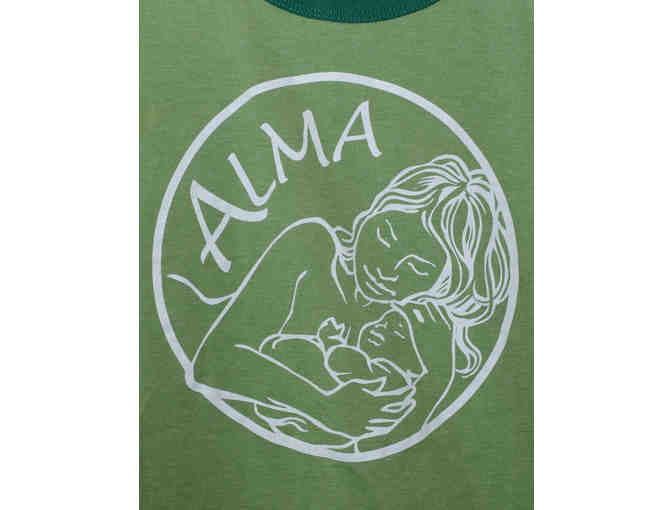 This soothing green T-shirt is printed with the Alma Mother and Child icon.