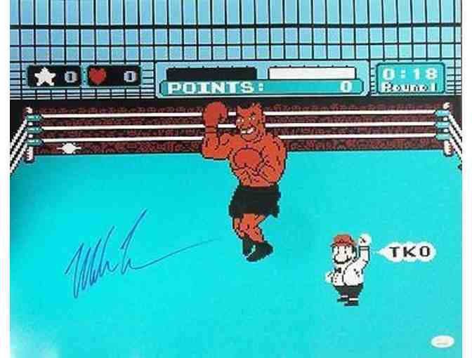 Boxing legend Mike Tyson has personally hand-signed this 16x20 photo of a 1980's Nintendo Classic.