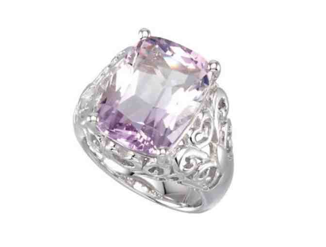 This stunning ring is created with a fabulous detailed open work in sterling silver, featuring hearts and swirl designs and a 16 x 12 mm faceted Rose de France Quartz stone. This ring is absolutely gorgeous! It is a beautiful, elegant and extremely stylish ring that is sure to be a favorite for years to come! Size 7.