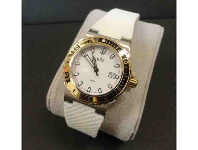 A lady's Julz Sportwatch in Stainless Steel with a gold plated rotating bezel . It has a screw on crown and a screw on back which makes it totally waterproof. The attached band is a white silicon with deployment buckle.