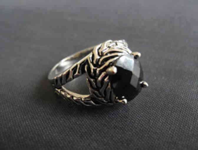 This is a ring by Premier Designs with a black faceted stone set in silver-toned metal. The diameter of the opening is 3/4". It comes in a red gift box.