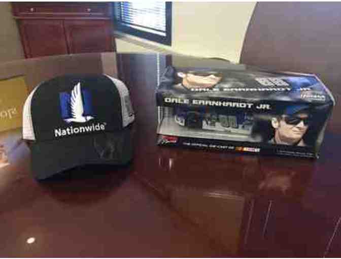 Every NASCAR fan should enjoy these racing accessories, compliments of Nationwide Insurance. This set starts with a Nationwide Series hat autographed by Dale Earnhardt Jr., and includes with a 2015 NNS Die-Cast Car.
