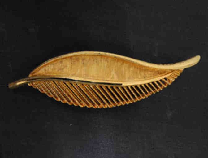 This gold colored metal leaf has ©BSK stamped on the back. It's 3 inches in length. The B. Steinberg-Kaslo Company created jewelry in NYC from the 1940s to the 1980s.