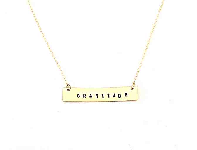 Gratitude stamped necklace made by Oxbow Designs, gold filled 16''.