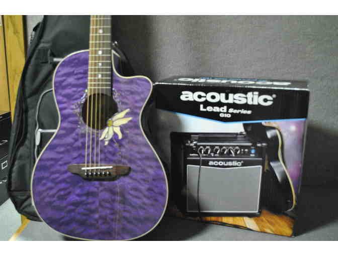 Luna "Passion Flower" acoustic/electric guitar, brand new, unused. Quilted maple top, back, and sides. Pre-amp and tuner. *Bonus add* Lead series G10 amp and quality guitar carrying case.