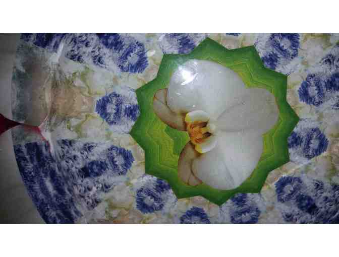This beautiful mandala plate is perfect for serving appetizers or desserts and is sure to get raves from your guests! The glass top of the plate can be washed with a wet cloth or sponge, but please do not submerge the plate in water.