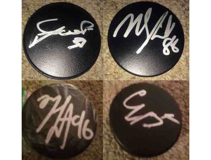 Enjoy 4 Washington Capitals autographed pucks including Michael Latta, Kuznetsov, Grubauer, and Nate Schmidt.