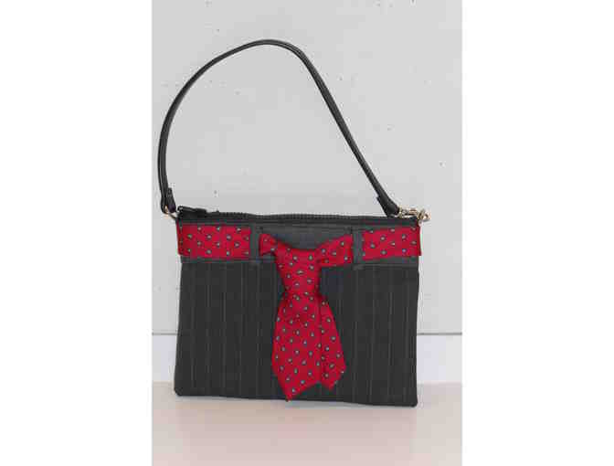 Fabric artist Marge Wilson created this bag from a recycled man's suit, with Liberty tie detail. The suit pocket forms the outside pocket of the bag with button closure. Red satin lining. Leather strap. Measures 7 1/4 x 9 1/2 inches.