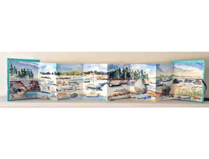 Summer in Brooklin, is an accordion book of an original watercolor of Center Harbor, by Marcia Stremlau.