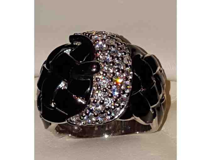 The beauty of Belle Etoille is magnified in a classic braid and buckle design of this stylish ring. With its combination of black and silver color, its crystalline sparkle, and its wide band, this ring is a versatile and an eye-catching addition to any wardrobe.