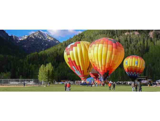Hot air balloon ride during Telluride Balloon Festival, June 3rd, 4th and 5th, 2016. Includes an invitation to the pilot registration party on June 3rd.