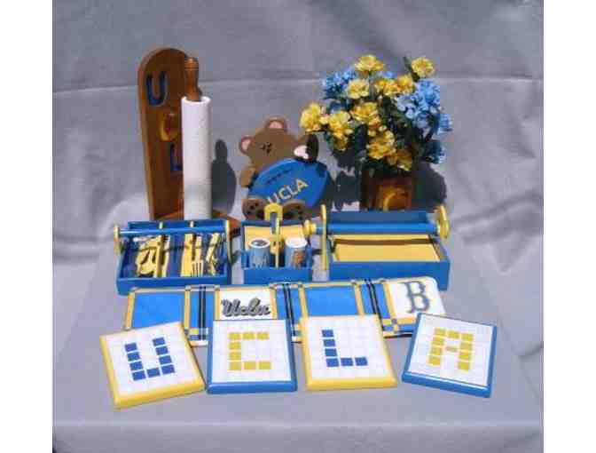 UCLA Paper Towel Holder, UCLA Flower Holder, UCLA Bear, Beat SC Joe Bruin, Silverware Carrier, Small Napkin Carrier, Large Napkin Carrier, Salt/Pepper Holder, Sugar Holder, U-C-L-A Mosaic Trivets, and a 52” x 82” UCLA Tablecloth. (Most items are handcrafted.)