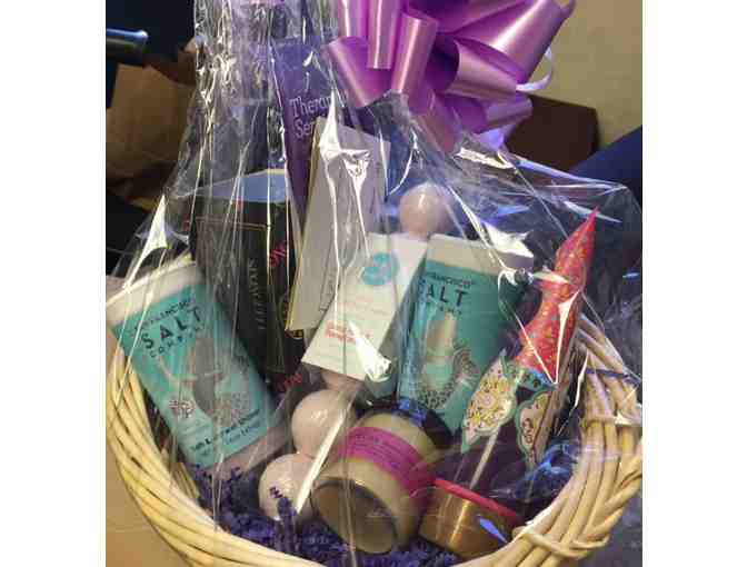 Spa Gift Basket with products and $50 Massage Envy gift card.