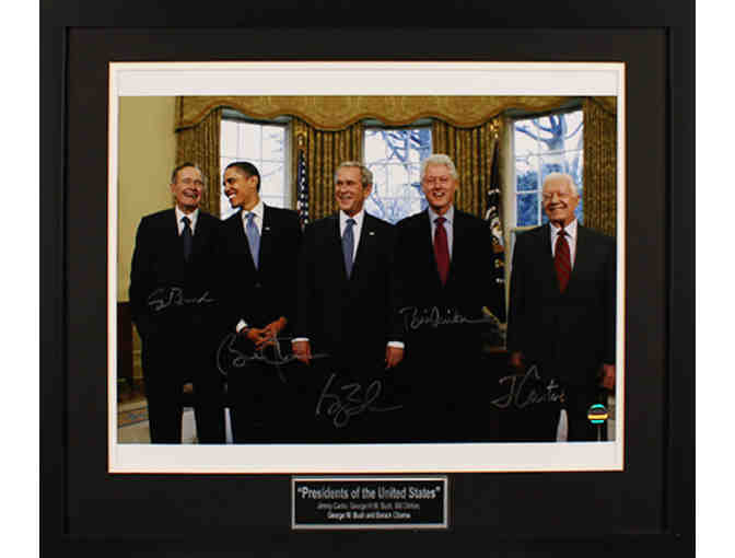 Autographed by Jimmy Carter, George H.W. Bush, Bill Clinton, George W. Bush, and Barack Obama Jimmy Carter was the 39th President of the United States from 1977 to 1981. He won the Nobel Peace Prize in 2002 for his decades of untiring effort to find peaceful solutions to international conflicts, to advance democracy and human rights, and to promote economic and social development. George H.W. Bush was the 41st President of the United States from 1989 to 1993. Bush was the Director of Central Intelligence from 1976-1977, and earned millions before that by getting into the oil business. Bill Clinton was the 42nd President of the United States, who served an 8 year term from 1993-2001. Bill became the third youngest president at age 46 during inauguration, and had the highest approval rating of any president since WWII. George Walker Bush is an American politician and businessman who was the 43rd President of the United States from 2001 to 2009 and the 46th Governor of Texas from 1995 to 2000. Barack Obama is the 44th President of the United States, and the first African