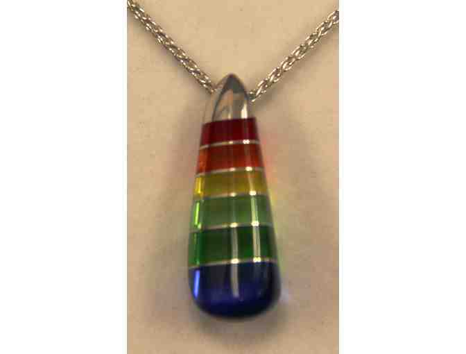 Beautiful sterling silver, multi-colored glass with silver banding pendant necklace, valued at $275, on an 18 inch chain.