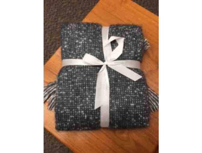This silver and gray throw measures 50" X 60". Keep warm and snuggly when it's chilly. Nice size for keeping in your car too!
