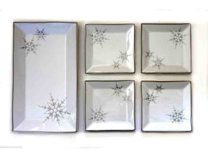 Charming snowflake design graces this porcelain serving tray and four 6"x6" plates.