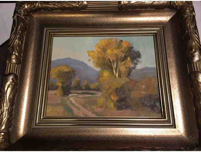 Donated from her personal art collection, this plein air oil painting by Utah artist Michael Calles invites the viewer to enjoy the bright light of an autumn day and the fall colors of the cottonwoods.