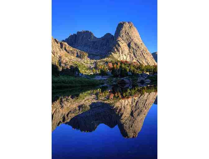 On a beautiful bluebird morning, Colorado photographer caught Pingora Peak in the Cirque of the Towers reflected in a glass pond. This print is number 116 of an exclusive 1,000 print series.