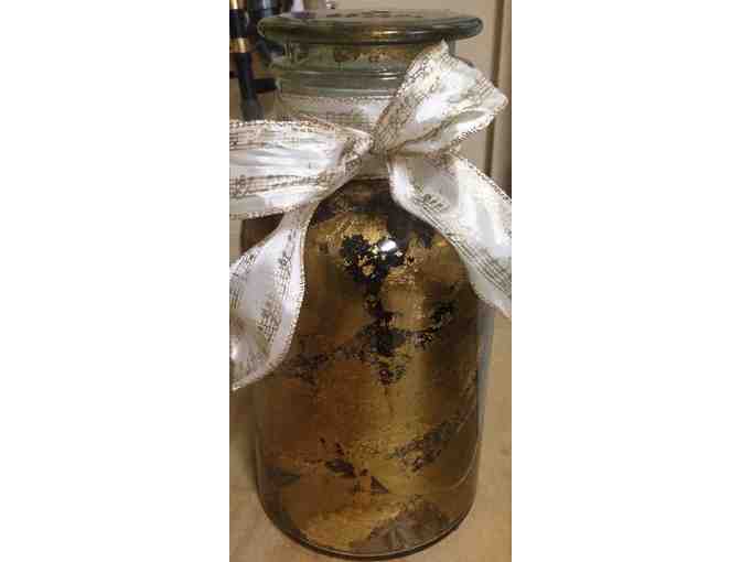 This item is a set of (2) Apothecary Style jars with lids. They are 2500ml press molded glass with gold leaf applied inside. Each is filled with natural star anise and are not food safe.