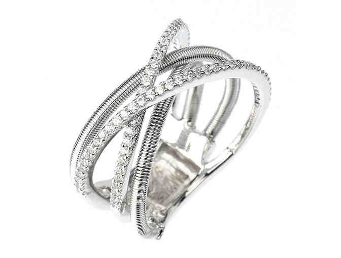 Modern and stylish sterling silver CZ criss cross ring. This ring is a great way to add modern elegance and a bit of sparkle to any event. Size 7. Rhodium plated. Proceeds benefit the Environmental Institute for Golf.