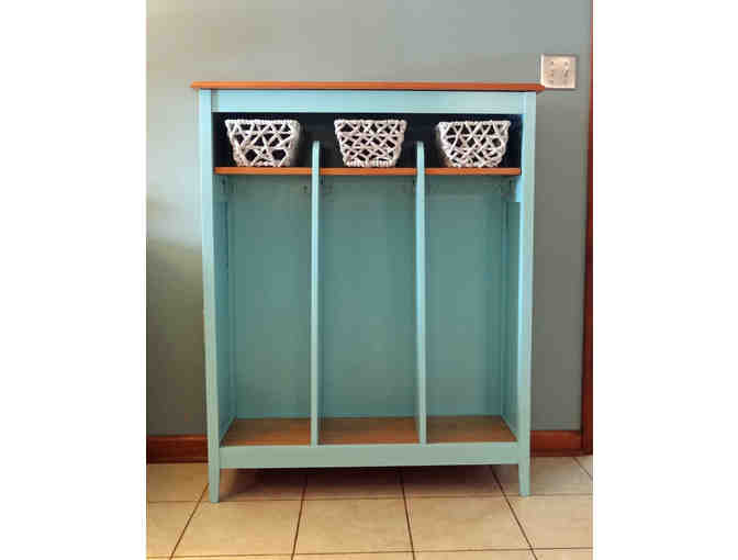 This light aqua Coat Cubby with 3 cubbies, 6 hooks, and 3 rustic baskets is great for holding coats, gloves, scarves and shoes and keeping the clutter at bay.