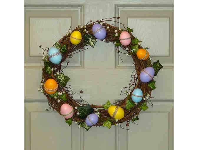 A natural wreath with ivy, baby's breath and hand painted eggs decorated with twine. Wreath measures approximately 7 inches across.