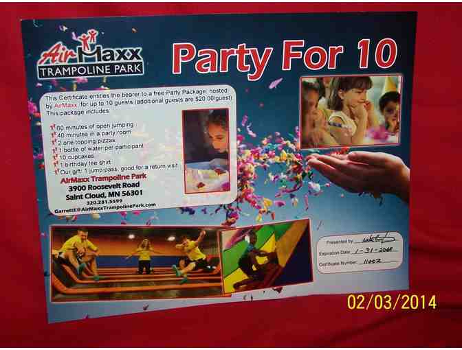 Great Birthday Party Idea! Good for 10. Includes 60 minutes of open jumping, 40 mintues in party room, 2 one topping pizza, 10 cupcakes, 1 bottle of water per participant and 1 free birthday t-shirt