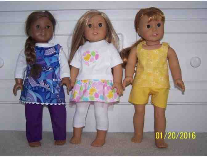 Doll Clothes for 18” Doll (Fits American Girl Dolls). 3-piece spring playset. Includes leggings, t-shirt and skirt. 2-piece shorts set and 3-piece playset which includes long-sleeve t-shirt, tunic and pants. Eight pieces. Shoes not included.
