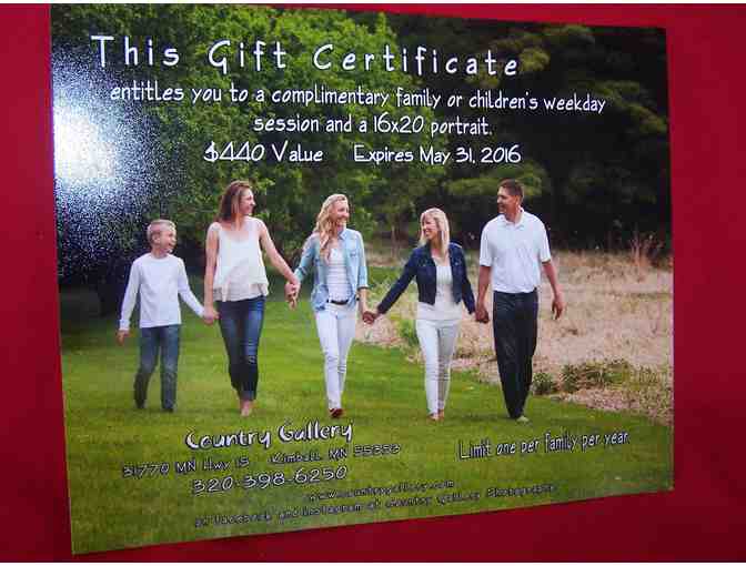 Complimentary family or children’s weekday photo session and a 16 x 20 portrait.