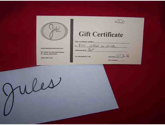 $25.00 Gift Certificate to enjoy food or drink at Jules Bistro in downtown St. Cloud, MN