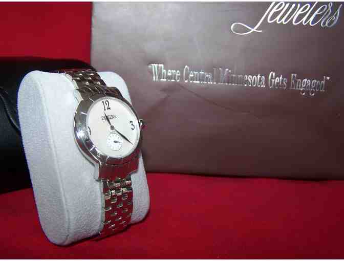 Stainless Steel D. J. Bitzan Swiss watch with mother of pearl dial: sapphire crystal for scratch resistance. Lifetime free batteries.